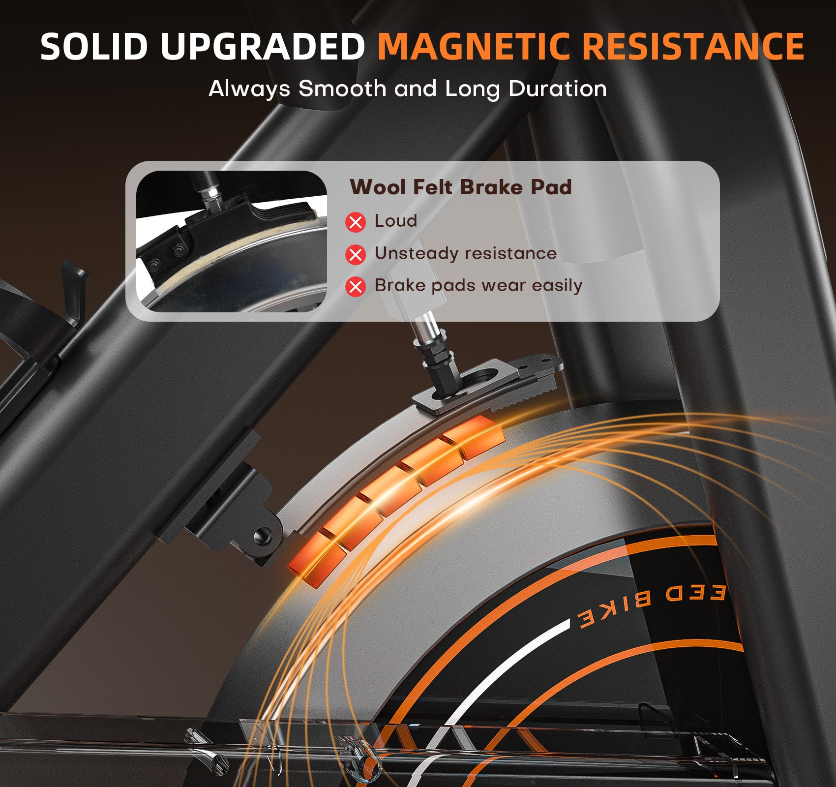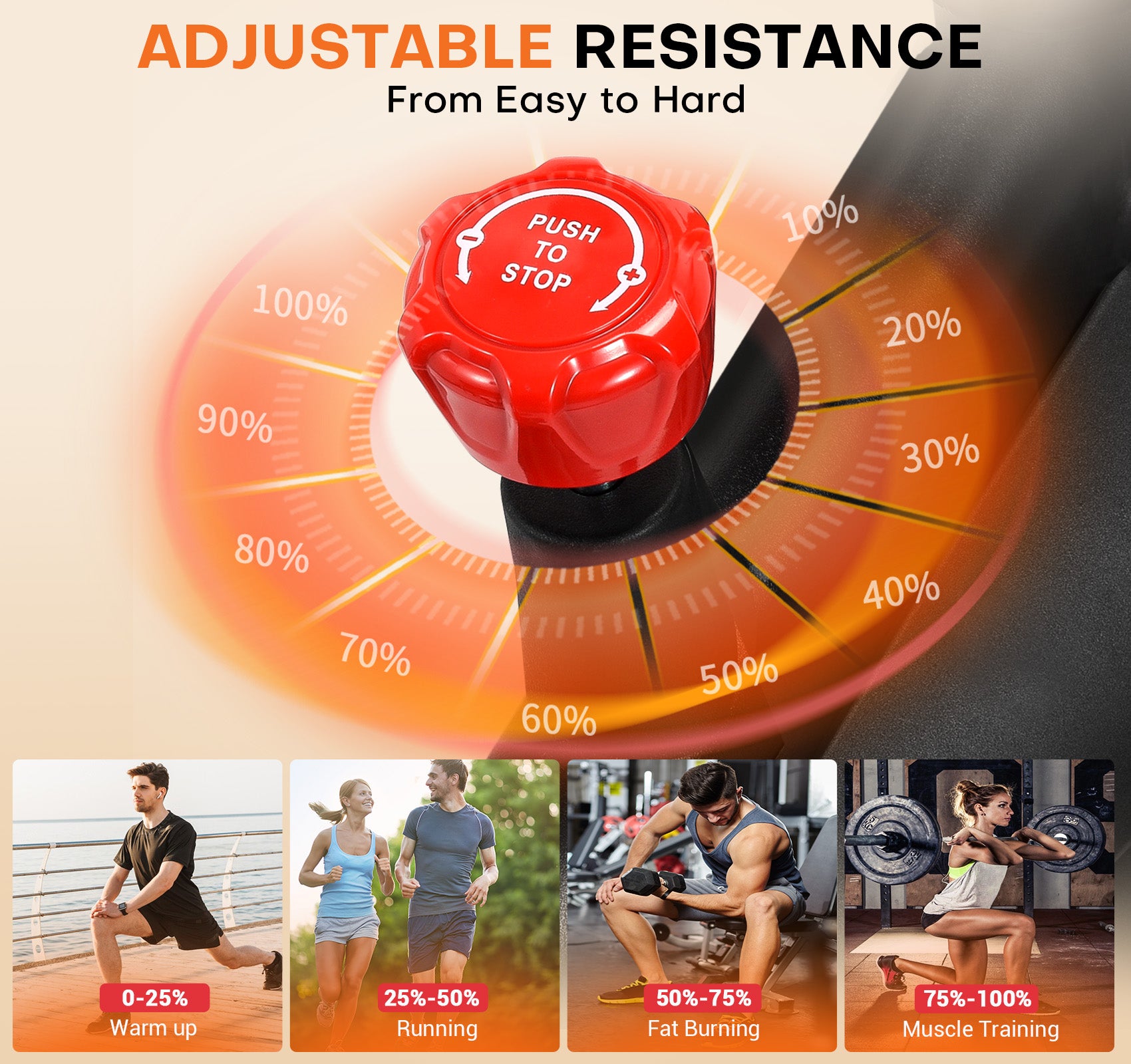 - RESISTANCE LEVELS VARY FROM EASY TO DIFFICULT: This workout bike features updated magnetic resistance, no squeaking of wool felt pads and no maintenance, and offers a wider adjustable range of resistance, with levels ranging from 0-20% for warm up, 20%-50% for running, 50%-80% for fat burning, 80%-100% for muscle strengthening. This 0-100% variation in resistance aligns with the daily exercise programs of individuals at different stages.